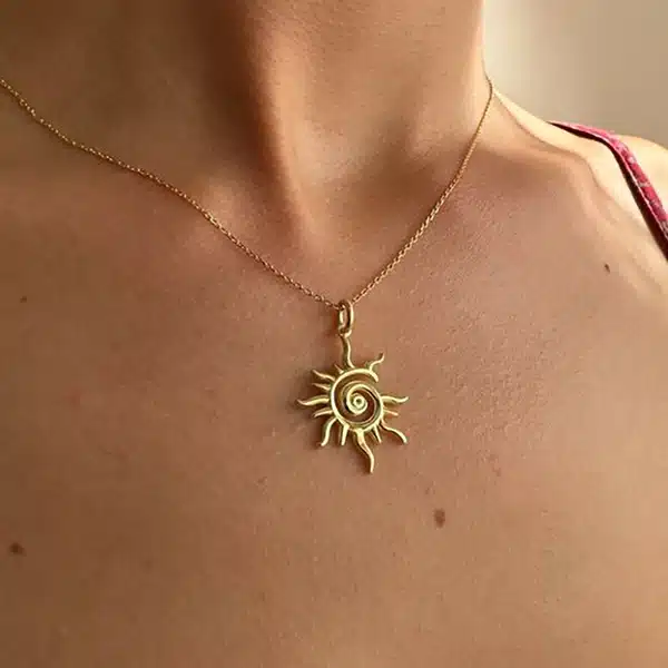 خورشید در جواهرات نمادی از قدرت، زندگی و انرژی بی‌پایان است. این طرح از تمدن‌های باستانی مانند مصر و مایاها الهام گرفته که خورشید را منبع حیات و نماد الهی پرستش می‌کردند. در طراحی‌های مدرن، خورشید اغلب به شکل دایره‌ای با پرتوهای ظریف یا برجسته ساخته می‌شود و می‌تواند با سنگ‌های زرد و نارنجی مانند سیترین یا کهربا تزیین شود تا گرما و روشنایی آن را تقویت کند. جواهرات با طرح خورشید حس امید، پویایی و آغاز تازه را به استایل اضافه می‌کنند.
