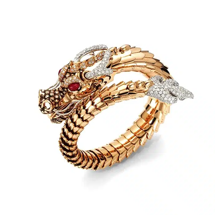 اژدها از شناخته‌شده‌ترین طرح‌های الهام‌گرفته از اسطوره‌هاست که بیشتر در فرهنگ‌های شرقی معنا پیدا کرده است. این نماد نشانه قدرت، خرد و محافظت به شمار می‌رود و معمولاً به شکل حکاکی روی انگشتر، آویز گردنبند یا گوشواره‌های خاص ساخته می‌شود. ترکیب طلا با سنگ‌هایی مانند یشم یا عقیق سیاه، جلوه‌ای مرموز و چشمگیر به طرح اژدها می‌دهد. در برخی نمونه‌ها، اژدها به دور سنگ اصلی حلقه می‌زند که نشان‌دهنده پاسداری و مراقبت است. استفاده از اژدها در میان نمادهای طلا و جواهر بیشتر برای کسانی رواج دارد که به دنبال قدرت و انرژی محافظتی هستند.